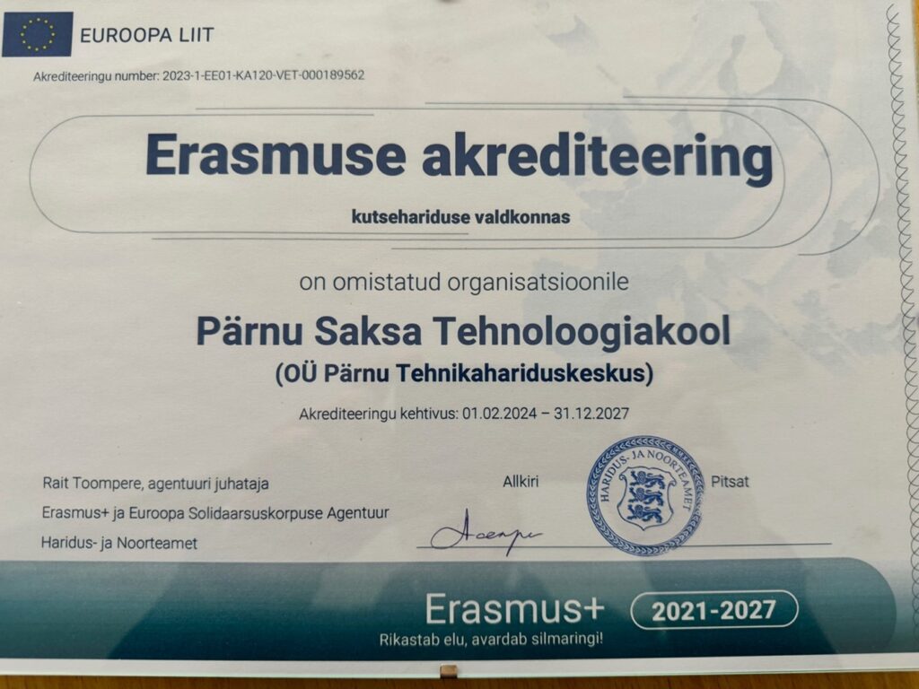 Kooli väljateenitud Erasmus+ õpirände akrediteering kuni aastani 2027 lubab sellel aastal käia kõigil kooli haridustöötajatel Saksamaal Bayeris ja Portugalis Braga linnas. Tegemist on töövarjutamisega, kus teemaks on praktikasüsteemi tundmaõppimine ja välismaal praktika sooritanute hindamine sealse hariduskorralduse kohaselt. Selle alusel planeerib kool iga praktikat ette valmistada sihtmaade meetoditele vastavalt ja hinnata õpilaste välispraktika sisu  vastavust meie õppekavadele.